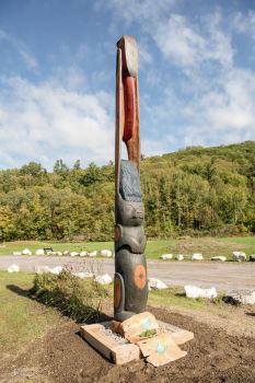 The fourteen-foot-high totem pole, created by artist Denis Charrette, is located at the Hollow Glen Community Centre. The art piece pays tribute to the First Nations and to the ancestral nature of the sector.