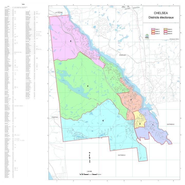 The Municipality of Chelsea is composed of six electoral districts, each comprising roughly the same number of voters.
